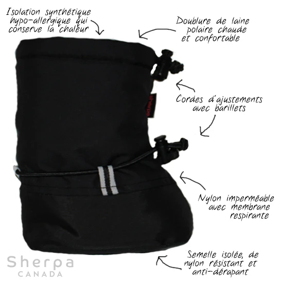 La botte d’hiver SHERPA Chic-Chocs G est idéale pour les temps froids avec votre bébé. Elle est faite de nylon imperméable et est doublé pour tenir les pieds de votre enfant au chaud jusqu’à -25°C. Son bungee à la cheville et en haut de la botte permettent de l’enfiler facilement et rapidement. Sa semelle extérieure souple et antidérapante est confortable pour les enfants qui ne mache pas encore ou qui sont sur le point de faire leurs premiers pas. Fabriqué au Québec.
