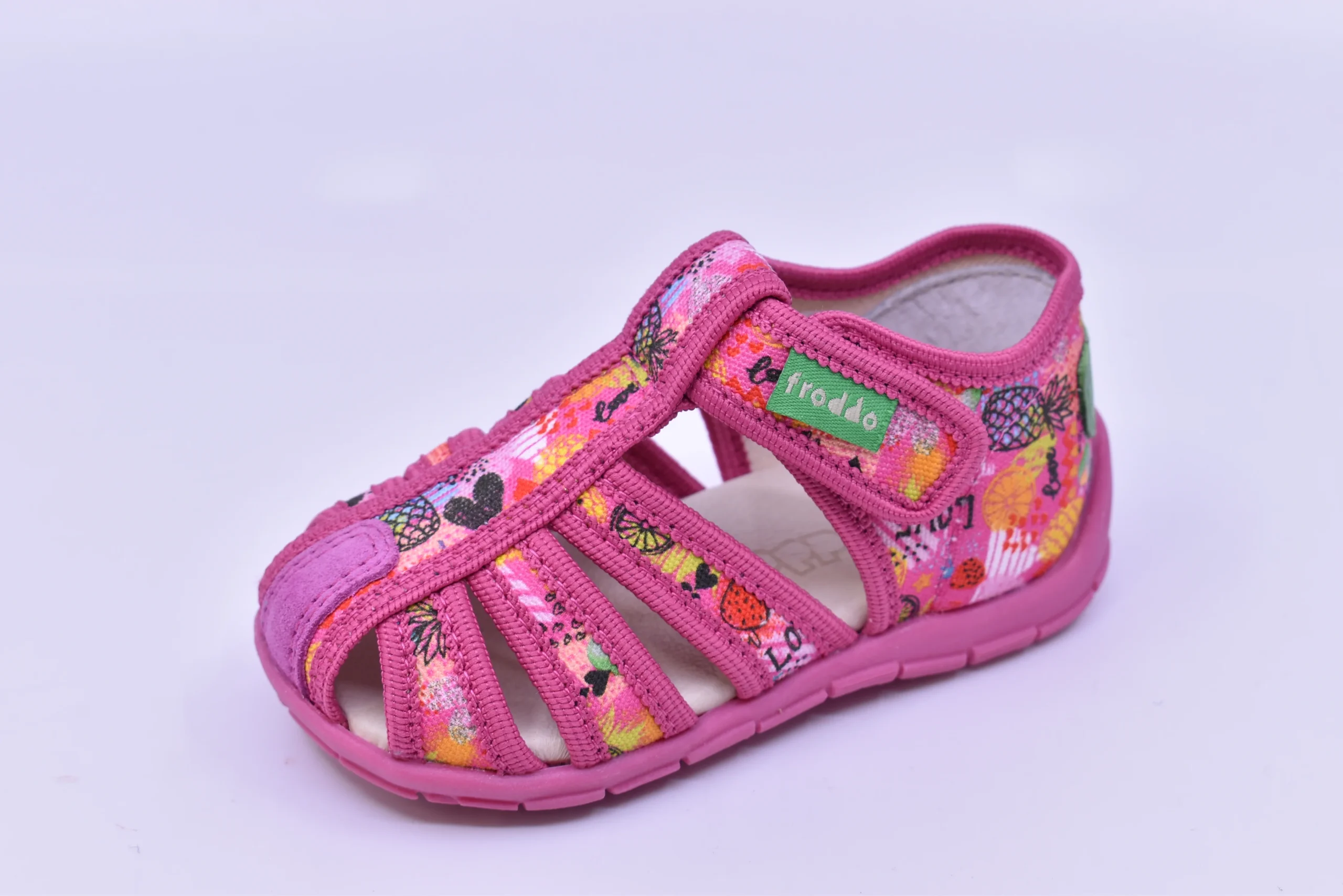 ***VENTE FINALE, AUCUN ÉCHANGE, AUCUN REMBOURSEMENT, AUCUNE NOTE DE CRÉDIT****La pantoufle sandale FRODDO G1700278 F est faite tissus. Sa semelle souple et antidérapante la rend confortable et sécuritaire. Jolie et coloré, elle peut faire office de sandale. Son velcro à la cheville la rend facile et rapide à enfiler.