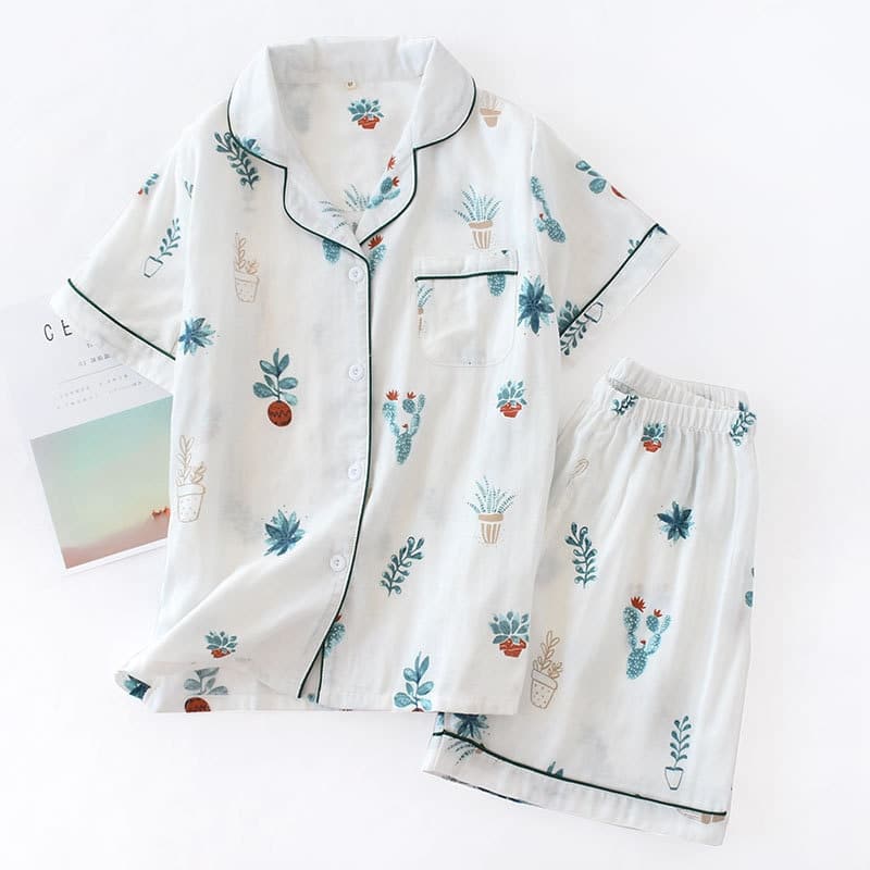 Pyjama d’été blanc manches courtes avec imprimé fleurs vertes