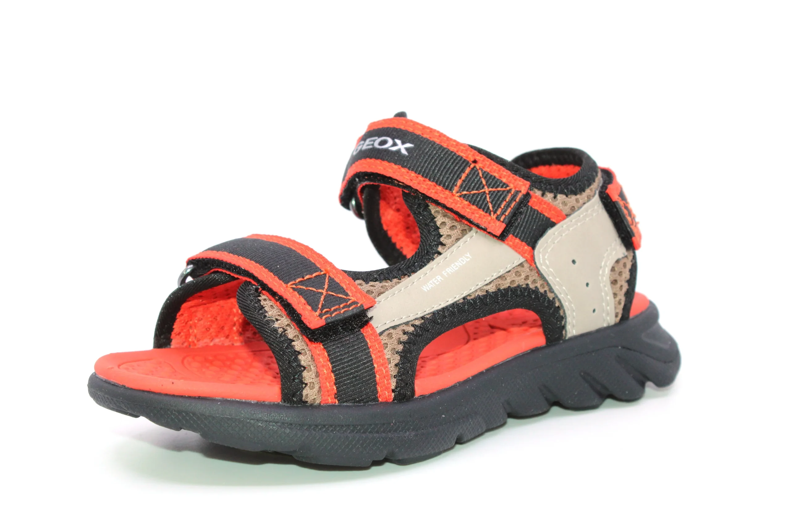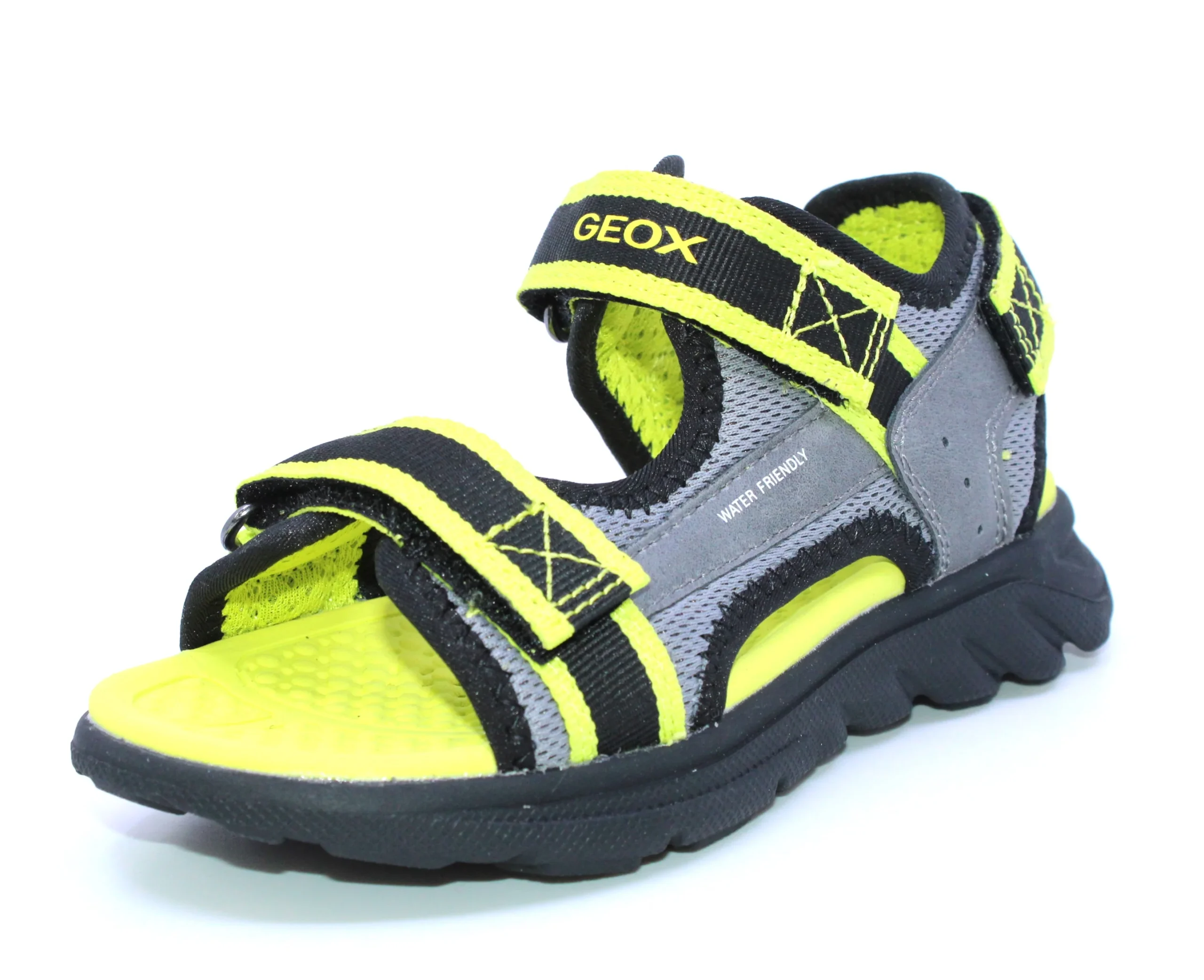 Prendre une grandeur de plus que le pied mesuré. La sandale GEOX Airadyum Sand G P-24 qui respirent accompagnera votre enfant avec soutien et confort dans ses activités. Ses trois velcros à la cheville, sur le dessus du pied et au talon permettent de l’enfiler facilement et rapidement. La conception Water Friendly tolère d’être légèrement mouillé. La technologie exclusive brevetée fait en sorte que la semelle extérieure respire, optimisant ainsi le confort. La semelle intérieure étudiée pour assurer commodité et hygiène est idéal pour garder les pieds au sec. (J45F1B 014ME C5051)